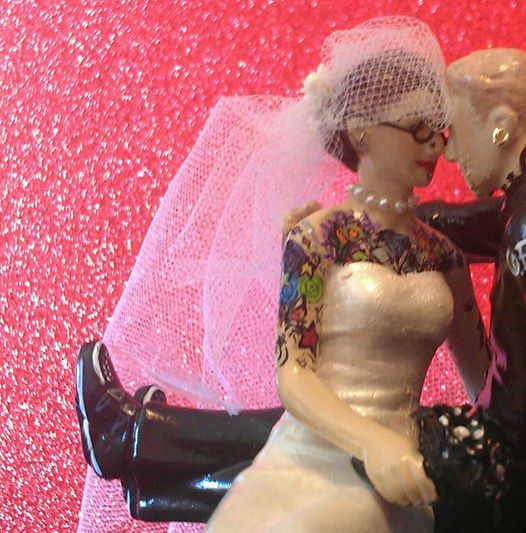 Custom hand painted biker wedding cake topper. I gave a modern wedding cake topper a complete repaint, adding new facial features, with beard and braid on the groom.